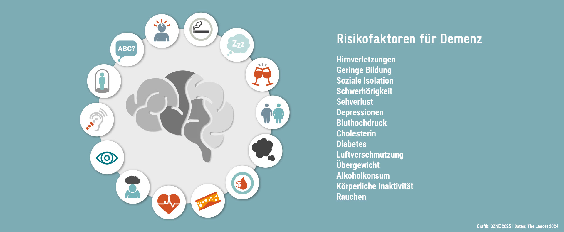 Quellen: * Pressemitteilung „Mehr als ein Drittel der Demenzfälle in Deutschland wäre vermeidbar“. Deutsches Zentrum für Neurodegenerative Erkrankungen (DZNE), Bonn, 9.12.2025 (Volltext).
